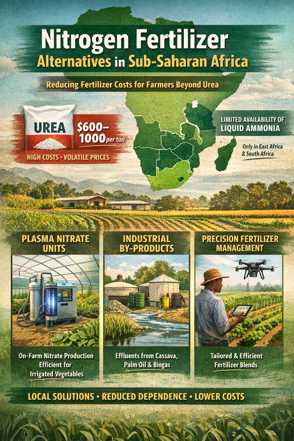 Nitrogen is the lifeblood of modern agriculture, but in SSA it comes at a steep price. Urea at $600–1000 per ton forces farmers into difficult choices. Liquid ammonia is only available in limited regions. The real alternatives are enterprise‑specific: plasma nitrate for irrigated vegetables, industrial by‑products for farms near agro‑industry hubs, and SSNM for larger enterprises.